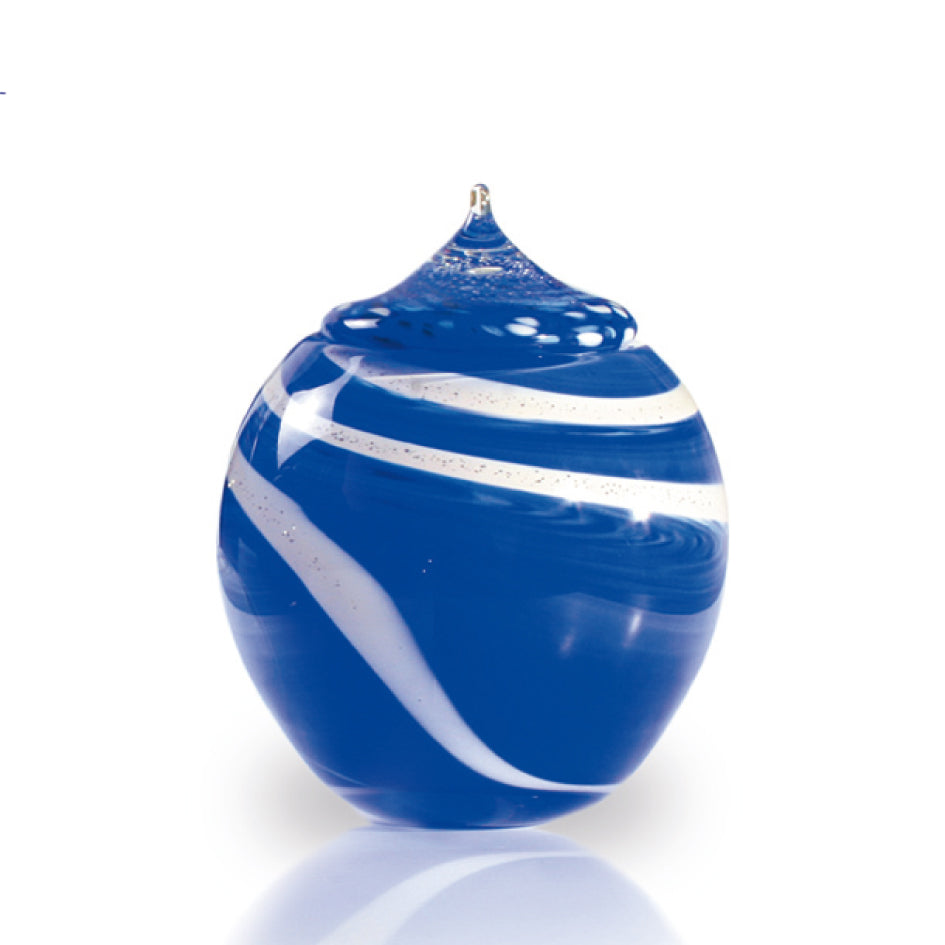 Deze glazen Urn is handgemaakt in de kleuren blauw en wit. Daar dat de kleuren mooi in elkaar lopen typeert dit het element water.